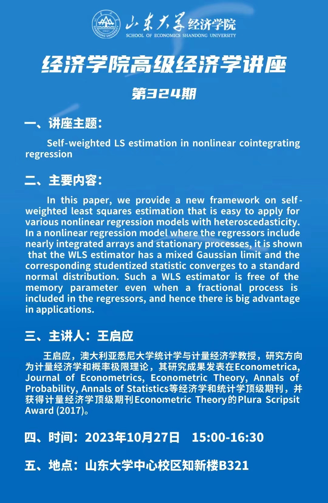 Self-weighted LS estimation in nonlinear cointegrating regression(tyc41183太阳成集团高级经济学讲座第324期)
