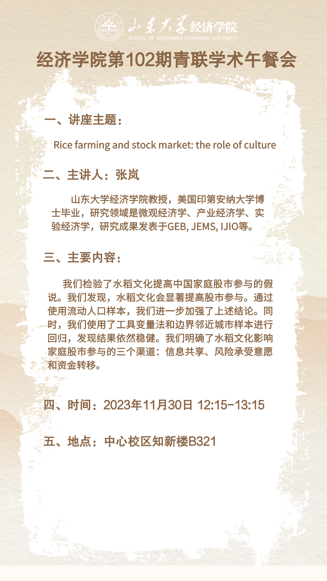 Rice farming and stock market :the role of culture(tyc41183太阳成集团第102期青联学术午餐会)