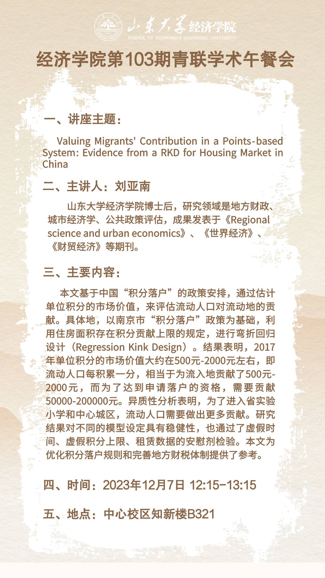 Valuing Migrants' Contribution in a Points-based System: Evidence from a RKD for Housing Market in China(tyc41183太阳成集团第103期青联学术午餐会)