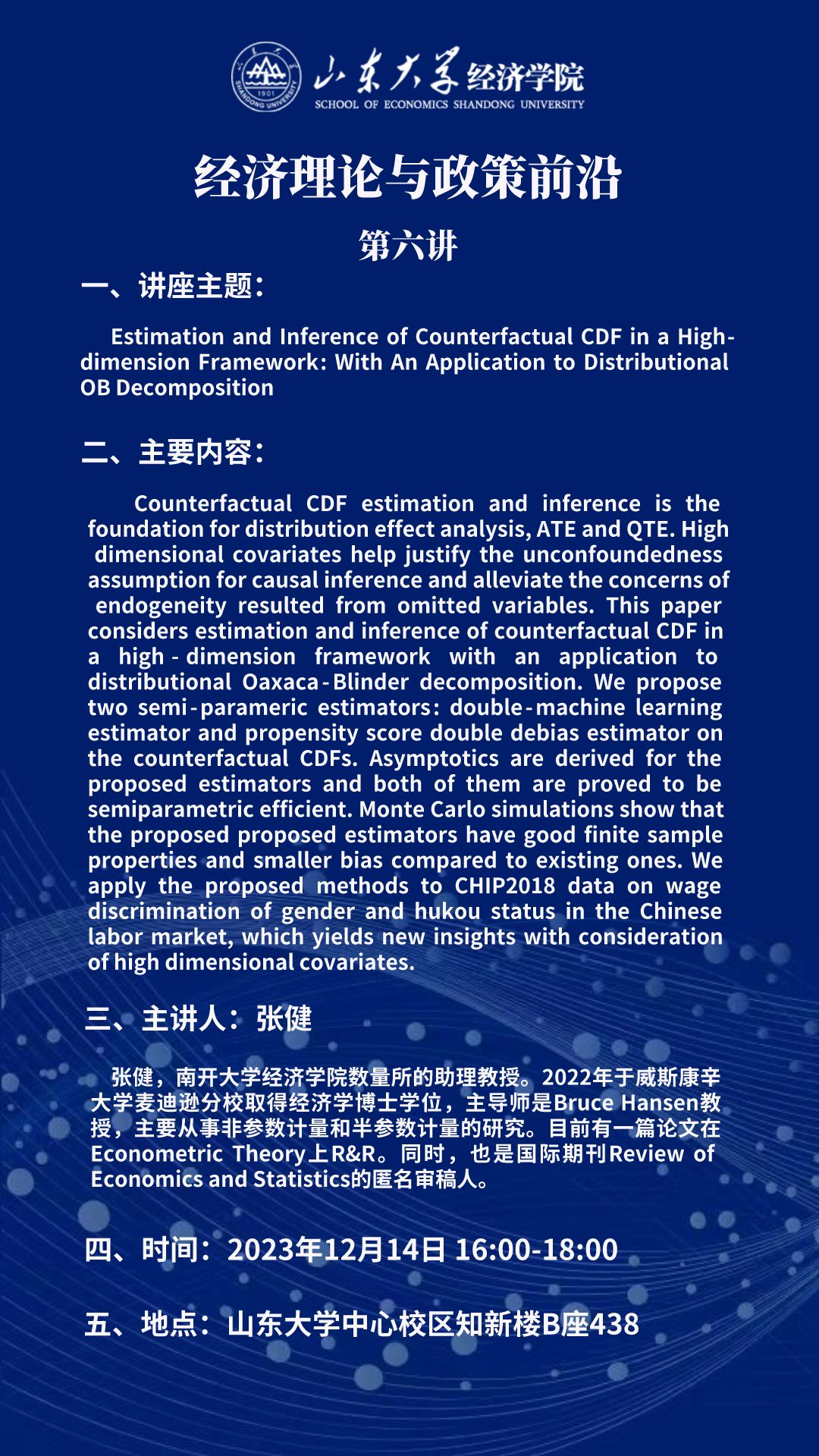 Estimation and Inference of Counterfactual CDF in a Highdimension Framework: With An Application to DistributionalOB Decomposition(经济理论与政策前沿第六讲)