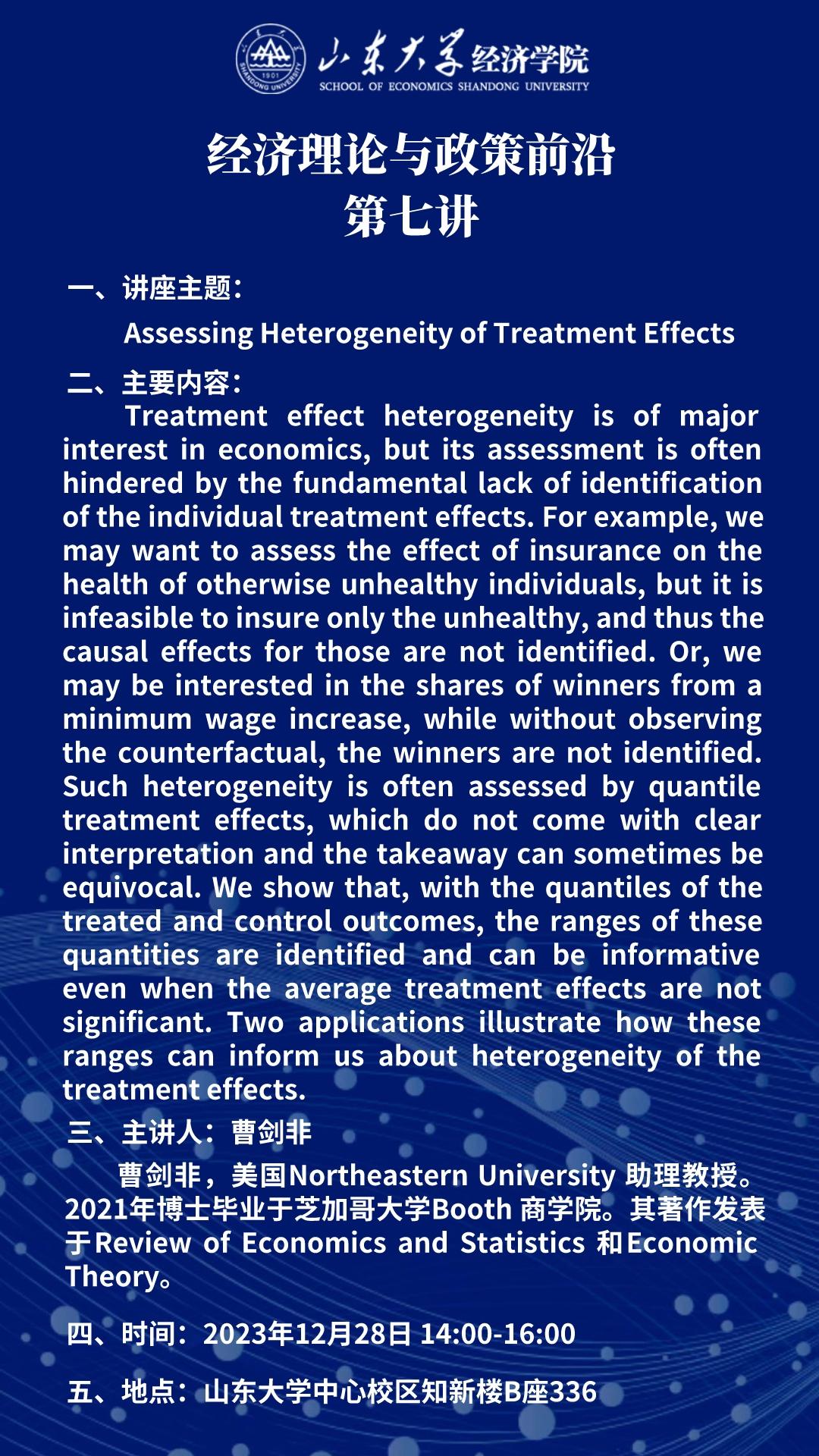 Assessing Heterogeneity of Treatment Effects(经济理论与政策前沿第七讲)
