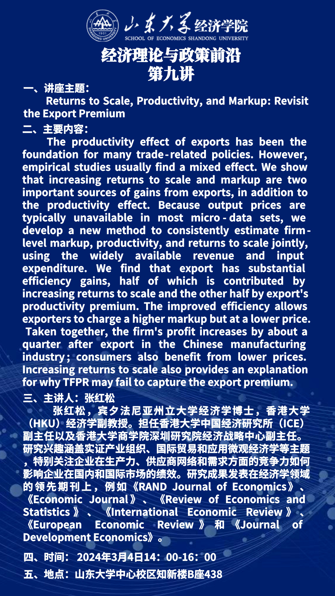 Returns to Scale,Productivity,and Markup:Revisit the Export Premium(经济理论与政策前沿第九讲)