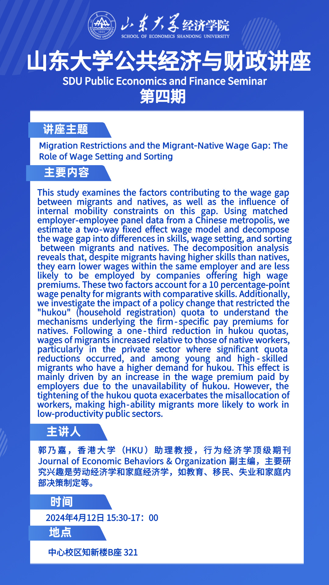 Migration Restrictions and the Migrant-Native Wage Gap: TheRole of Wage setting and sorting(太阳成集团tyc41183公共经济与财政讲座第四期)
