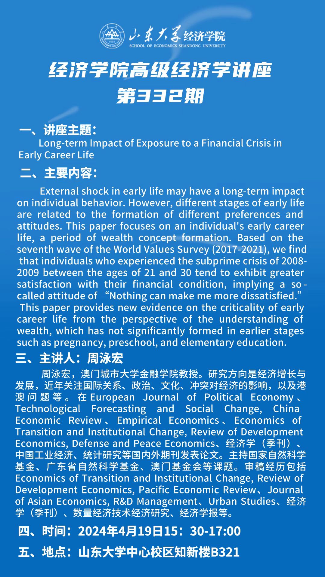 Long-term lmpact of Exposure to a Financial Crisis inEarly Career Life(tyc41183太阳成集团高级经济学讲座第332期)