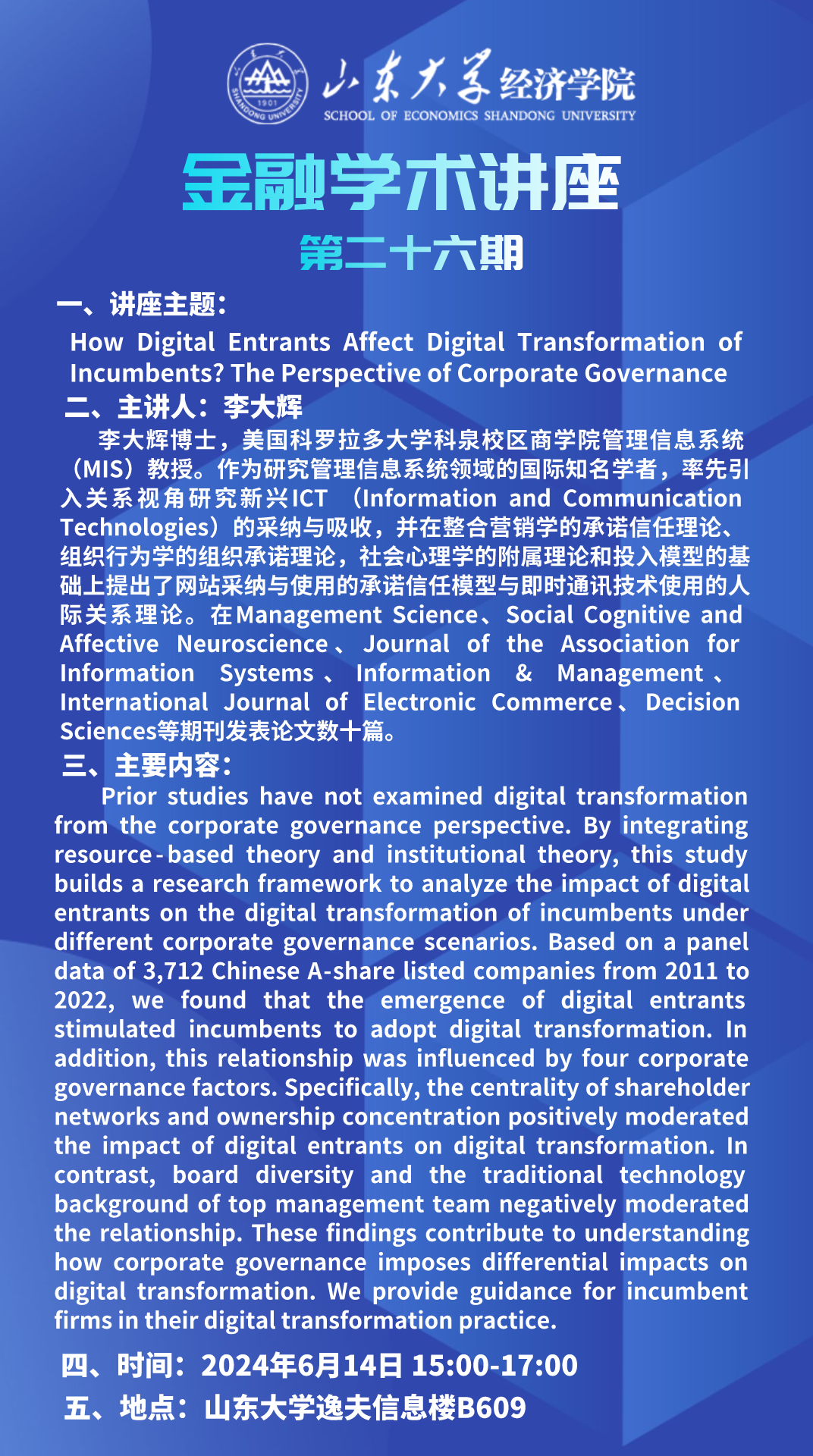 How Digital Entrants Affect Digital Transformation of Incumbents?The Perspective of Corporate Governance(金融学术讲座第二十六期)