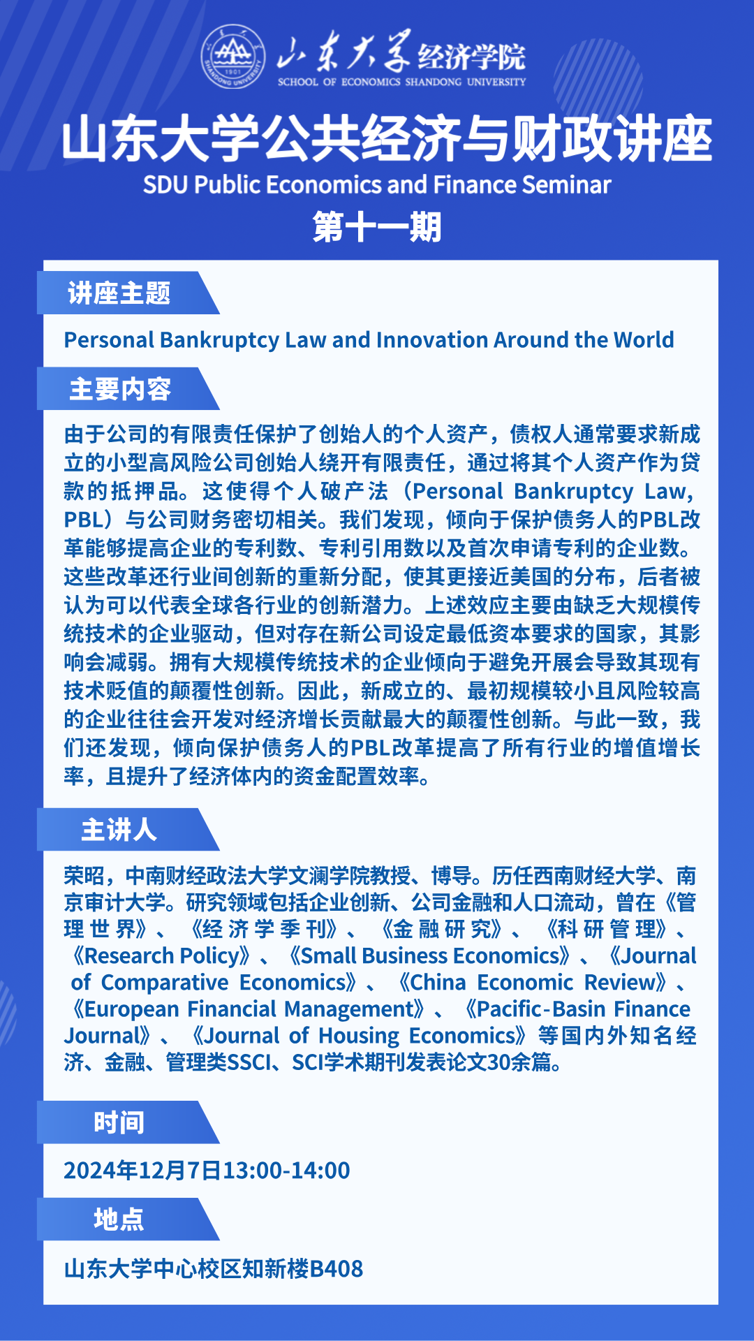 Personal Bankruptcy Law and Innovation Around the World(太阳成集团tyc41183公共经济与财政讲座第十一期)