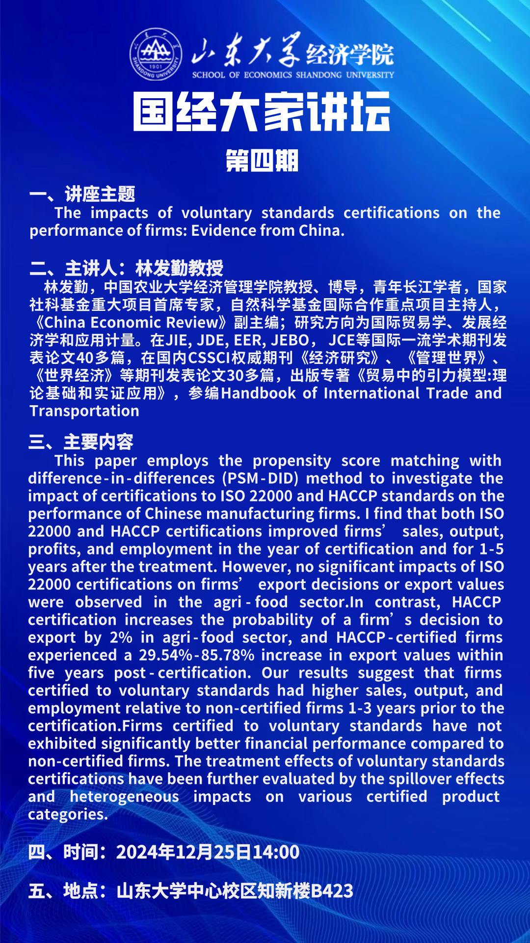 The impacts of voluntary standards certifications on the performance of firms:Evidence from China(国经大家讲坛第四期)