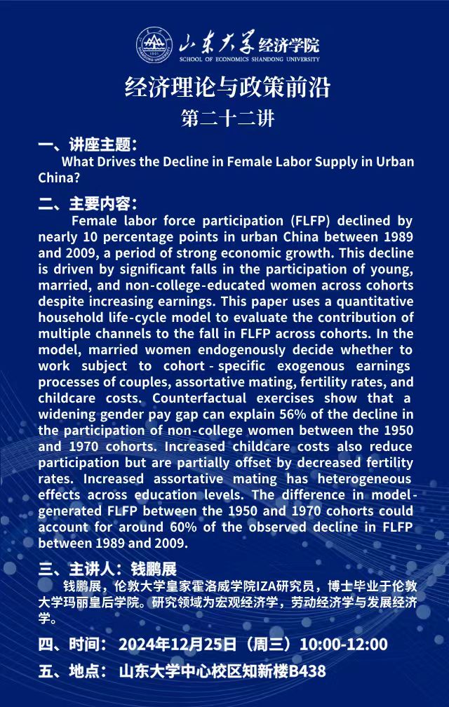 What Drives the Decline in Female Labor supply in Urban China?(经济理论与政策前沿第二十二讲)