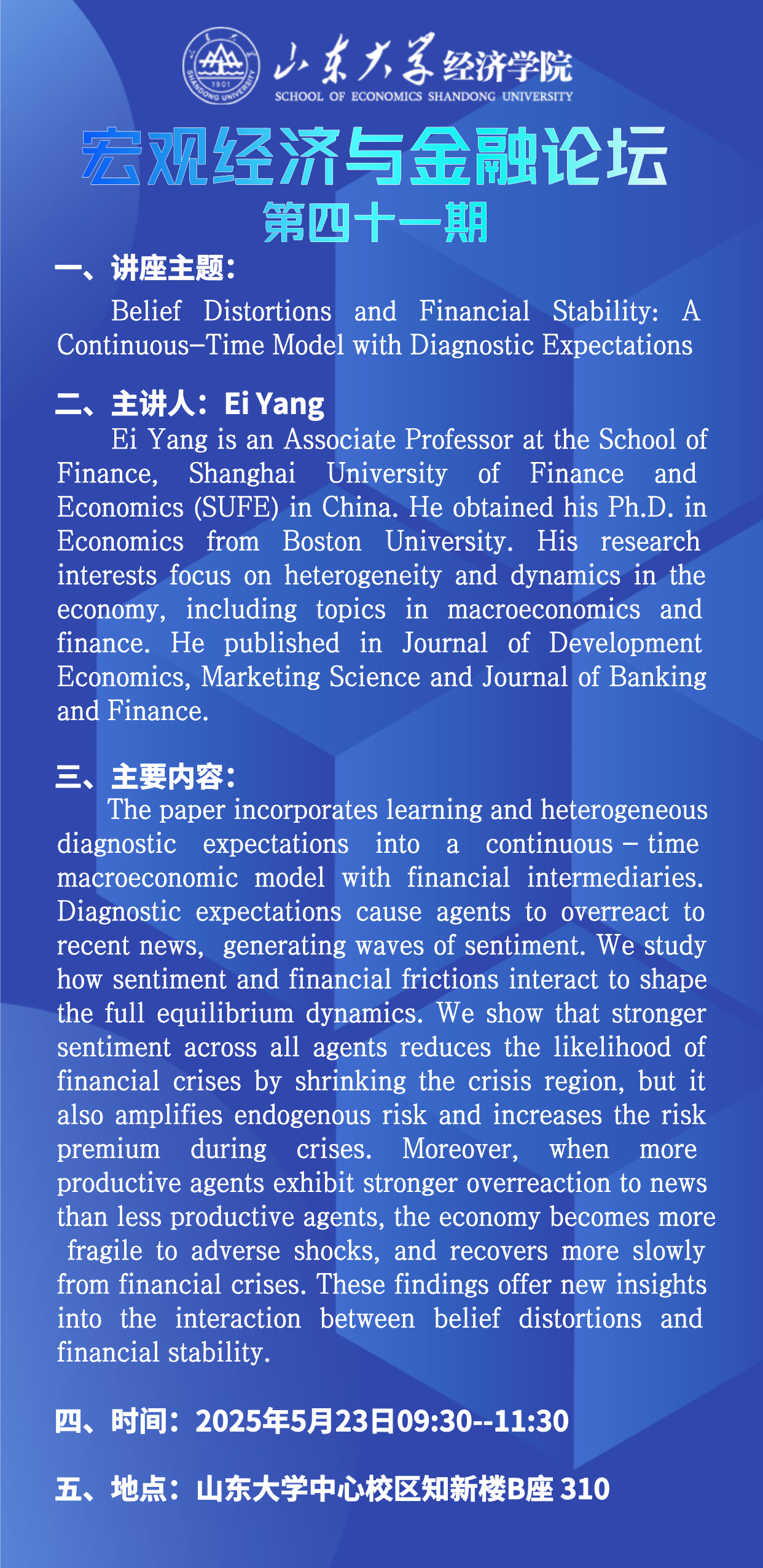 Belief Distortions and Financial Stability: A Continuous-Time Model with Diagnostic Expectations(宏观经济与金融论坛第四十一期)