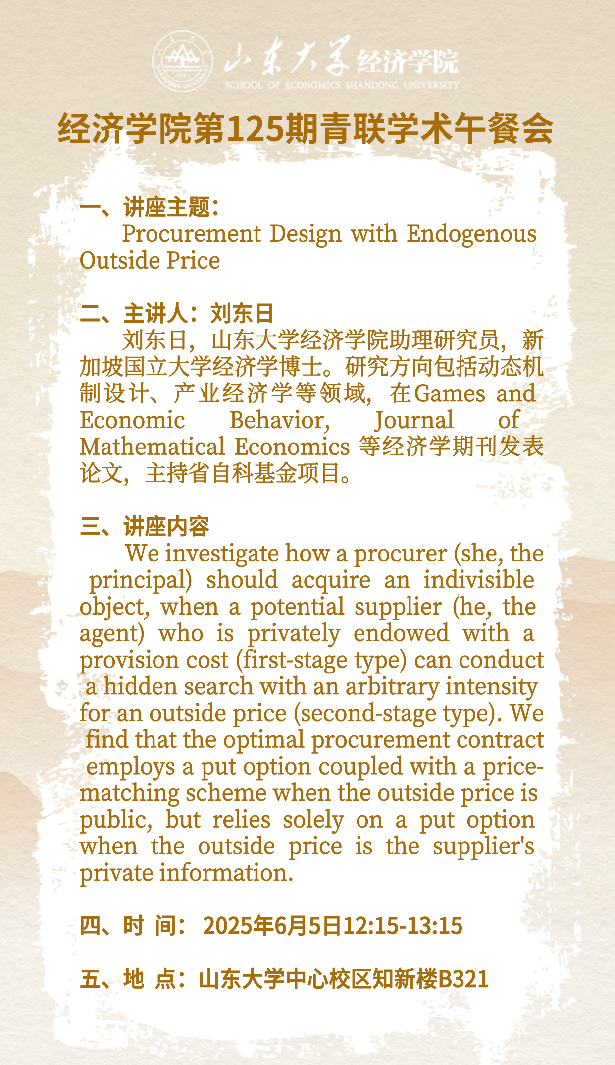 Procurement Design with Endogenous Outside Price(tyc41183太阳成集团第125期青联学术午餐会)