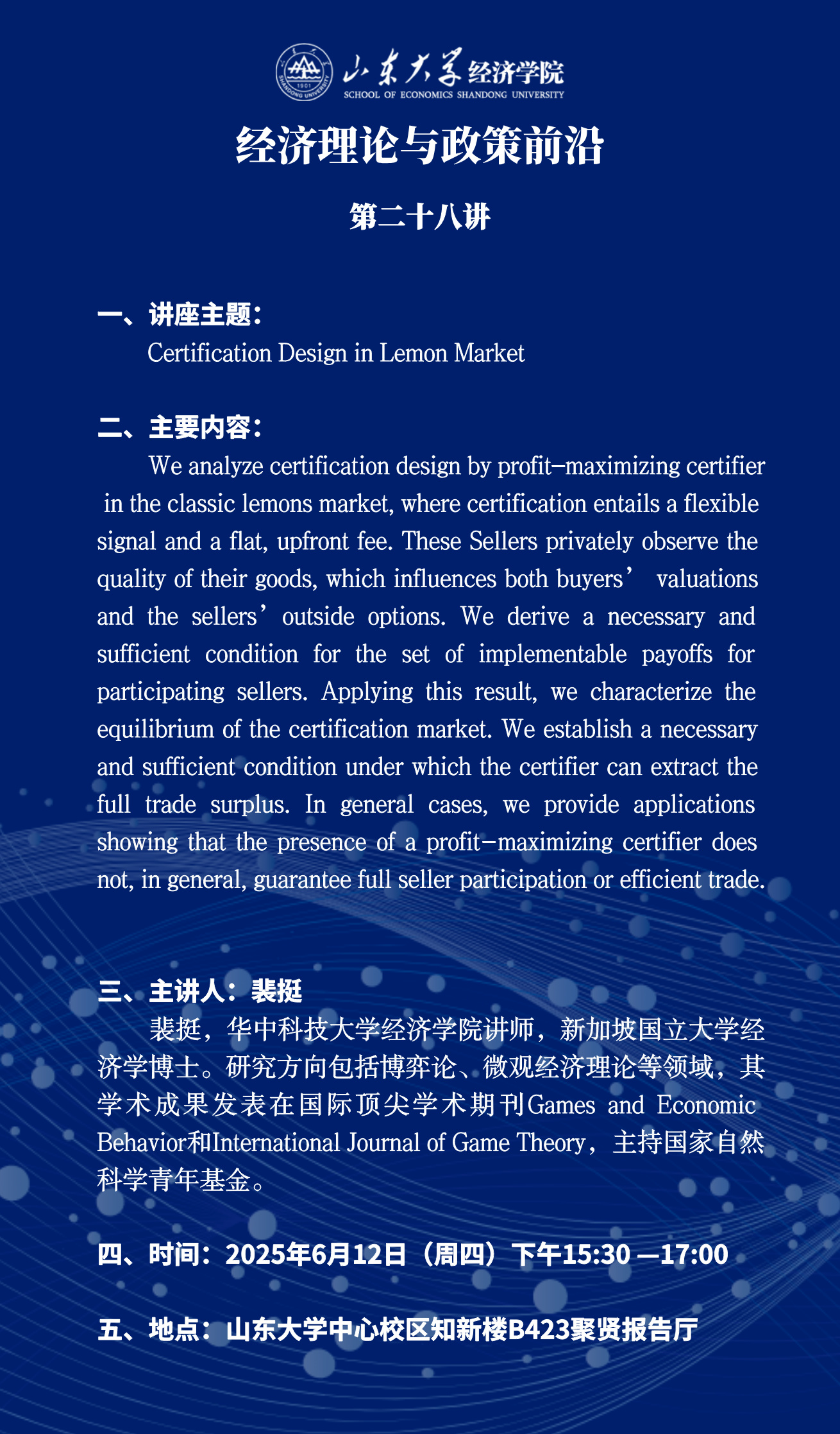 Certification Design in Lemon Market(经济理论与政策前沿第二十八讲)