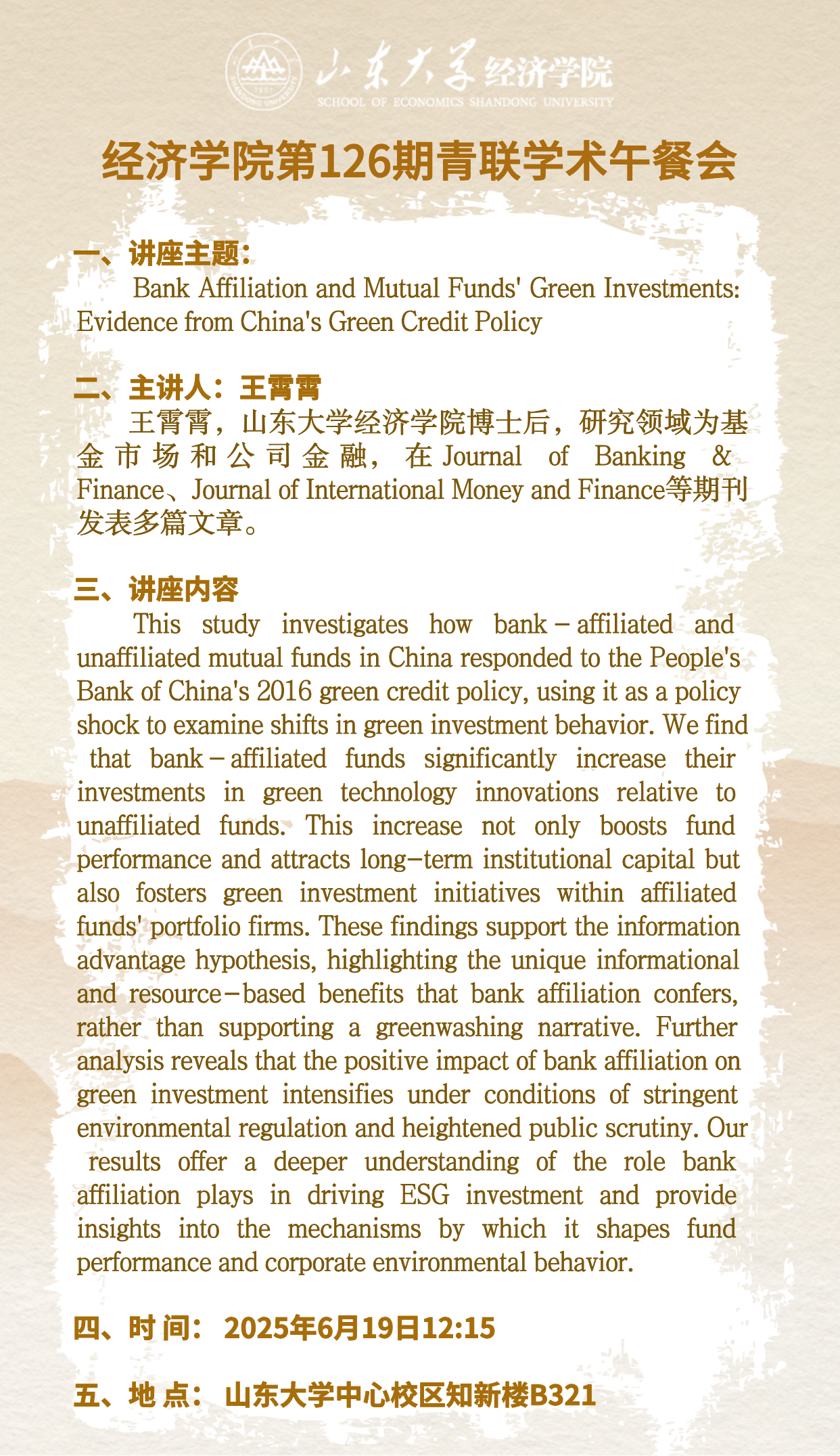 Bank Affiliation and Mutual Funds’ Green Investments: Evidence from China’s Green Credit Policy(tyc41183太阳成集团第126期青联学术午餐会)