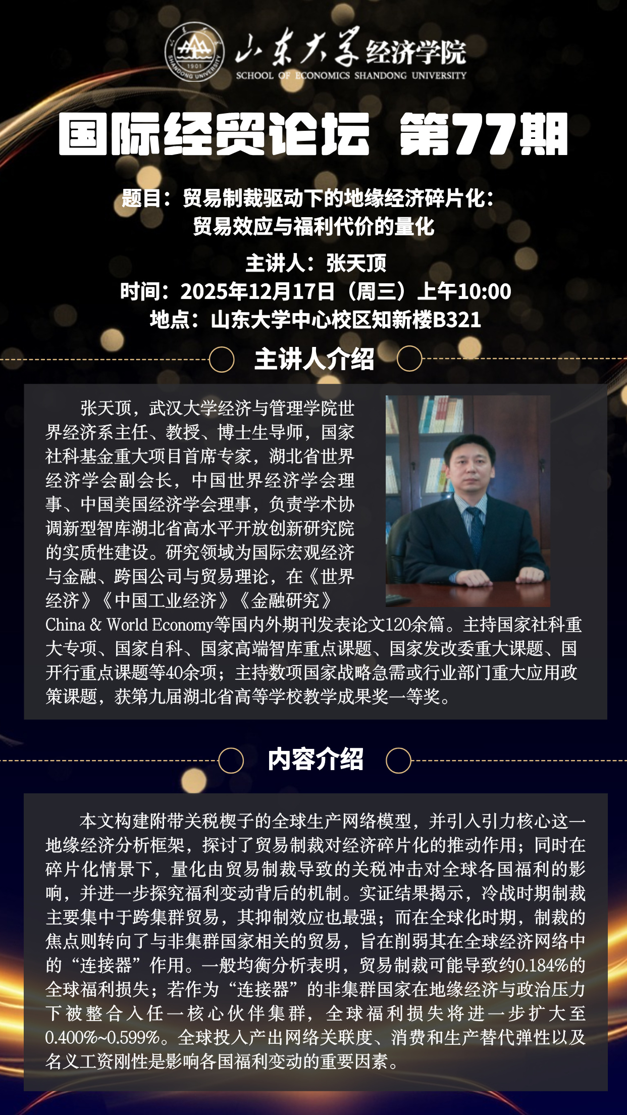 贸易制裁驱动下的地缘经济碎片化:贸易效应与福利代价的量化(国际经贸论坛第77期)
