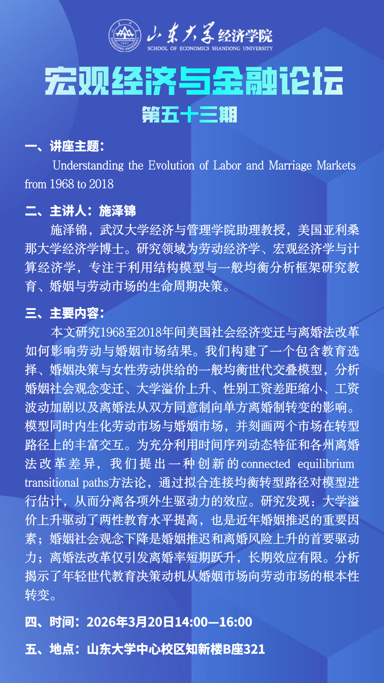 Understanding the Evolution of Labor and Marriage Marketsfrom 1968 to 2018(宏观经济与金融论坛第五十三期)