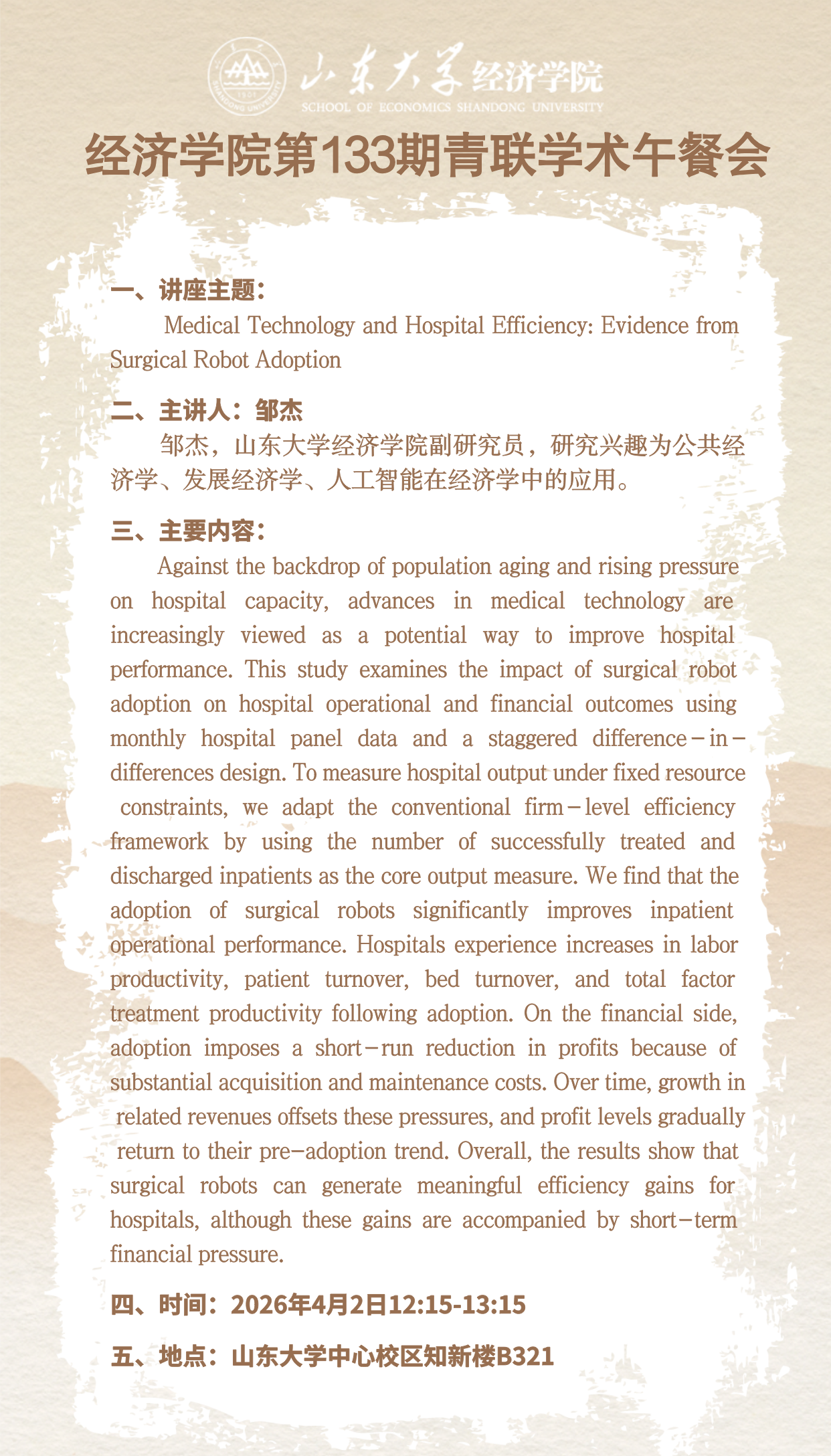 Medical Technology and Hospital Efficiency: Evidence from Surgical Robot Adoption(tyc41183太阳成集团第133期青联学术午餐会)