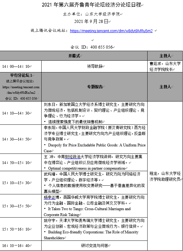 2021年第六届齐鲁青年论坛经济分论坛日程