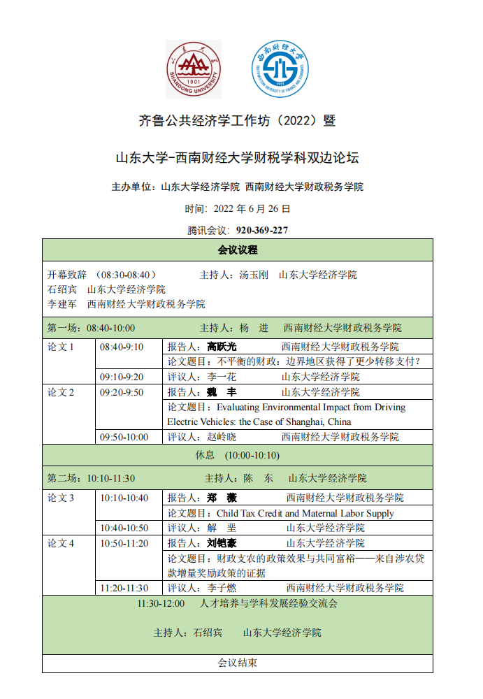 齐鲁公共经济学工作坊(2022)暨太阳成集团tyc41183-西南财经大学财税学科双边论坛