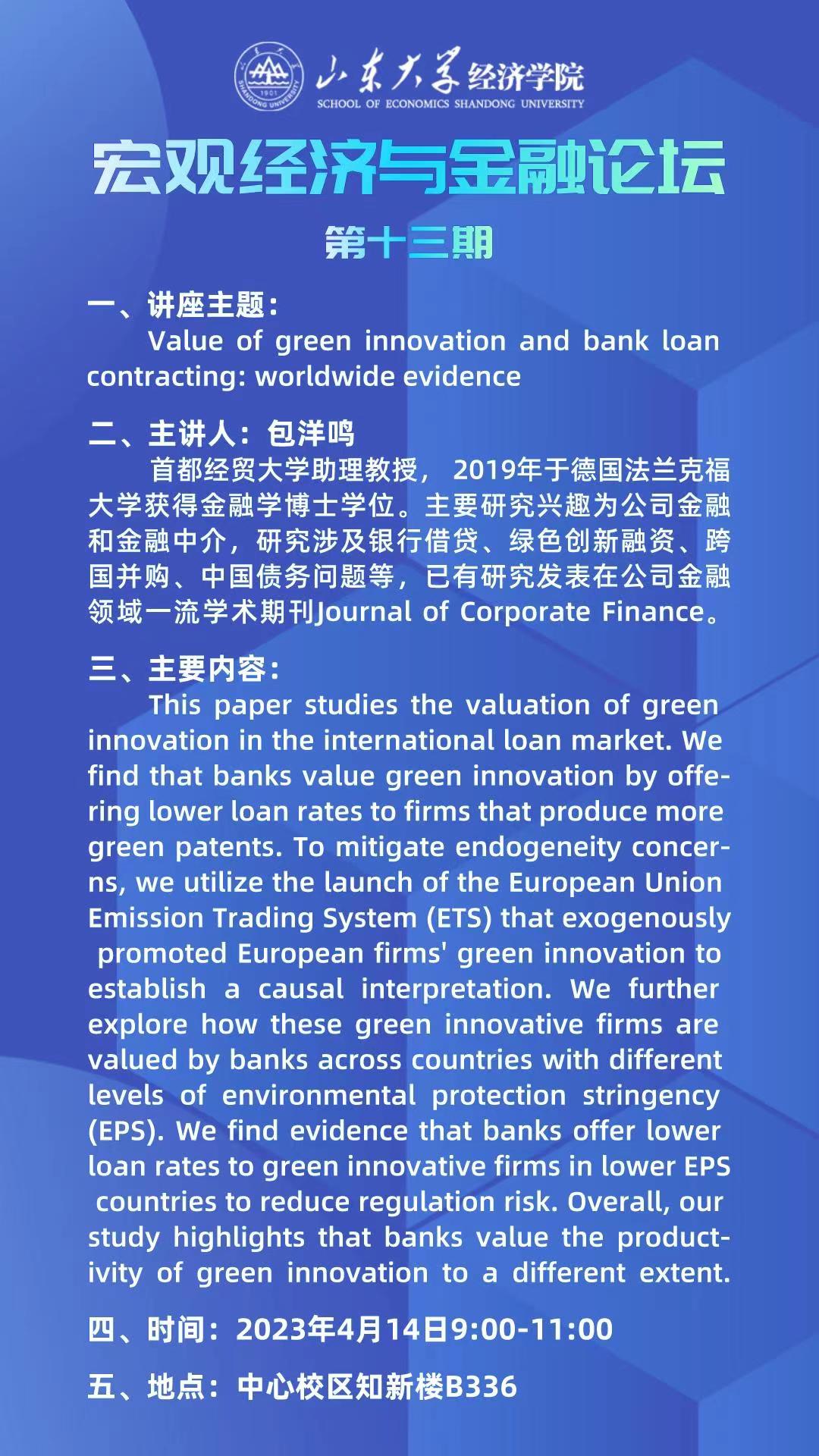 Value of green innovation and bank loan contracting : worldwide evidence(宏观经济与金融论坛第十三期)