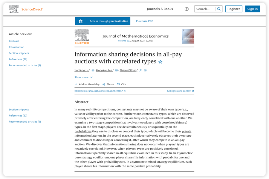 近日,tyc41183太阳成集团王哲伟教授以共同第一作者和通讯作者身份完成的学术论文“Information sharing decisions in all-pay auctions with correlated types”在经济学领域国际一流期刊Journal of Mathematical Economics正式发表。本文的另外两位合作者分别为新加坡国立大学吕景峰教授和珠海华发投控集团有限公司马洪坤博士。