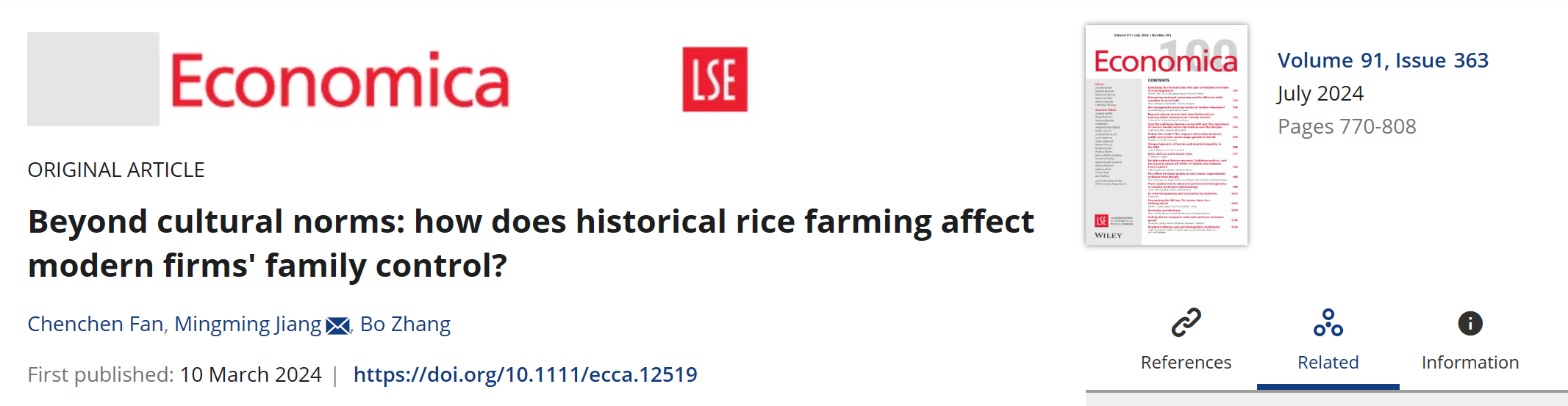 近日,tyc41183太阳成集团姜明明教授、张博副教授与山东财经大学财政税务学院范辰辰副教授合作完成的学术论文“Beyond cultural norms: how does historical rice farming affect modern firms’ family control?”在国际知名经济学期刊Economica正式发表。姜明明教授为通讯作者,张博副教授、范辰辰副教授为共同第一作者。