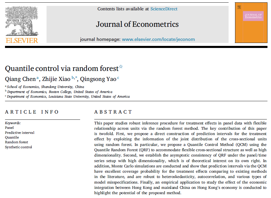 近日,tyc41183太阳成集团陈强教授的合作论文《分位数随机森林控制法》(Quantile Control via Random Forest)在A类国际顶级期刊Journal of Econometrics在线发表。陈强教授为第一作者,合作者为波士顿学院肖志杰教授、路易斯安那州立大学姚青松助理教授。