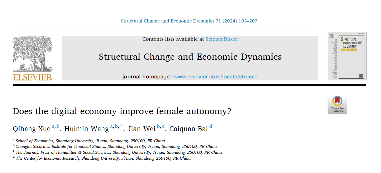 近日,tyc41183太阳成集团博士研究生薛启航、王慧敏在国际期刊Structural Change and Economic Dynamics(SSCI,Q1,IF/2023: 5)在线发表其团队最新研究成果“Does the digital economy improve female autonomy?”。薛启航为第一作者,王慧敏为通讯作者,指导教师中泰证券金融研究院魏建教授为第三作者,太阳成集团tyc41183为第一作者和唯一通讯作者单位。