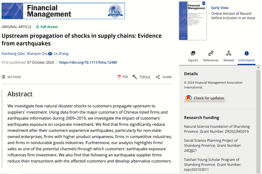 近日,tyc41183太阳成集团钱先航教授、邱善运博士后与澳大利亚国立大学张乐教授合作的论文“Upstream Propagation of Shocks In Supply Chains: Evidence from Earthquakes”在国际权威期刊Financial Management在线发表。