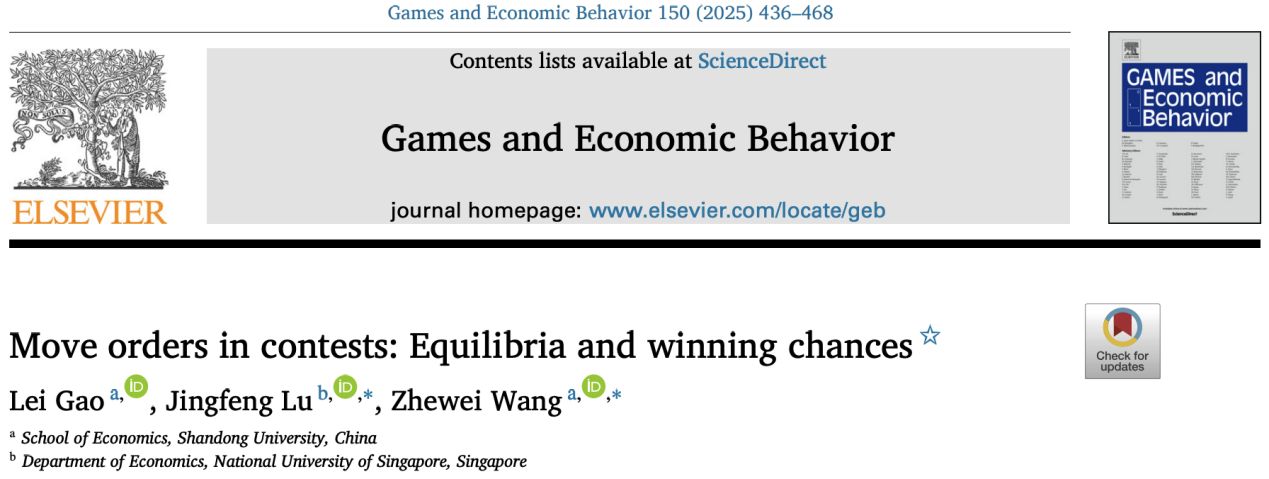 近日,tyc41183太阳成集团王哲伟教授、高磊与新加坡国立大学吕景峰教授的合作论文“Move orders in contests: Equilibria and winning chances”在博弈论领域国际顶级期刊Games and Economic Behavior正式发表。