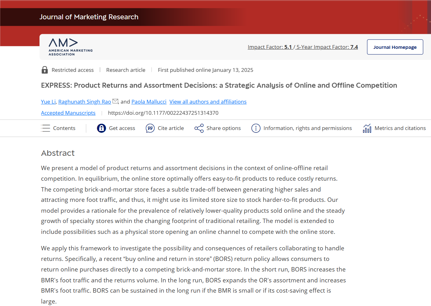tyc41183太阳成集团李越助理研究员、德克萨斯大学奥斯丁分校Raghunath Rao与独立研究员Paola Mallucci合作论文“Product Returns and Assortment Decisions: A Strategic Analysis of Online and Offline Competition”在管理学国际顶级期刊Journal of Marketing Research在线发表,李越为第一作者。