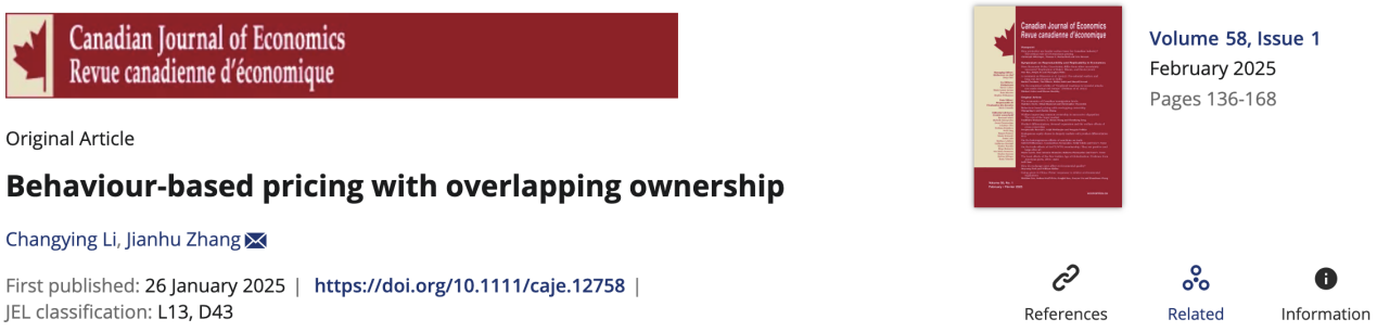 近日,tyc41183太阳成集团李长英教授、张剑虎教授合作学术论文“Behaviour-based pricing with overlapping ownership”在国际权威期刊Canadian Journal of Economics正式发表。李长英教授为第一作者,张剑虎教授为通讯作者。