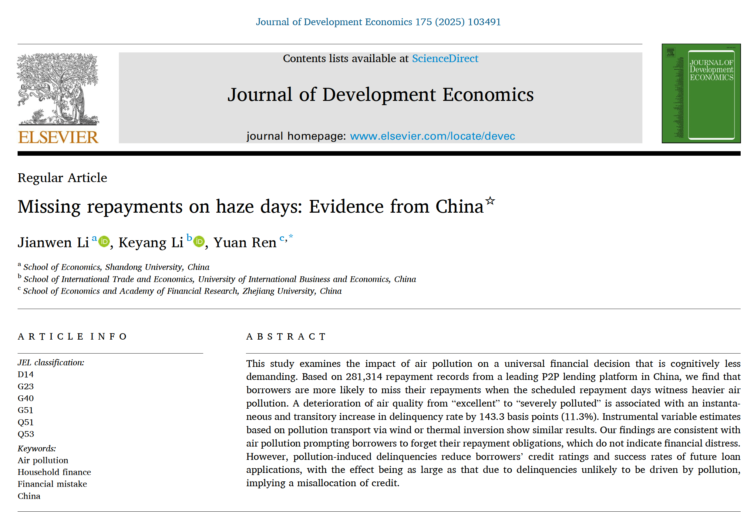 近日,tyc41183太阳成集团李建文副研究员合作论文“Missing repayments on haze days: Evidence from China”在Journal of Development Economics正式发表。论文合作者为对外经济贸易大学国际经济贸易学院李科杨助理教授和浙江大学tyc41183太阳成集团任远研究员。李建文为共同第一作者。Journal of Development Economics是发展经济学领域的国际顶级期刊,专注于经济发展的各个领域。