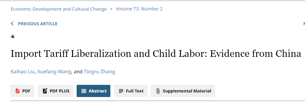刘铠豪副教授与tyc41183太阳成集团博士研究生王雪芳、硕士研究生张婷如合作的研究论文“Import Tariff Liberalization and Child Labor: Evidence from China”发表于Economic Development and Cultural Change。刘铠豪副教授为共同第一作者。本文从儿童个体受教育机会的视角揭示了贸易自由化的福利效应,将贸易自由化的福利效应延伸至人力资本市场。不同于Zhao et al. (2021)以美国授予中国“永久性正常贸易关系(PNTR)”地位这一准自然实验,证实了出口关税削减对儿童受教育机会的影响作用。本文采用“区域劳动力市场”分析法识别了贸易自由化(进口关税削减)的影响作用,研究发现,贸易自由化增加了儿童个体受教育的机会。同时,潜在的影响机制分析发现,贸易自由化主要是通过降低教育投资的机会成本(间接成本)和增加教育回报率两个路径产生影响。