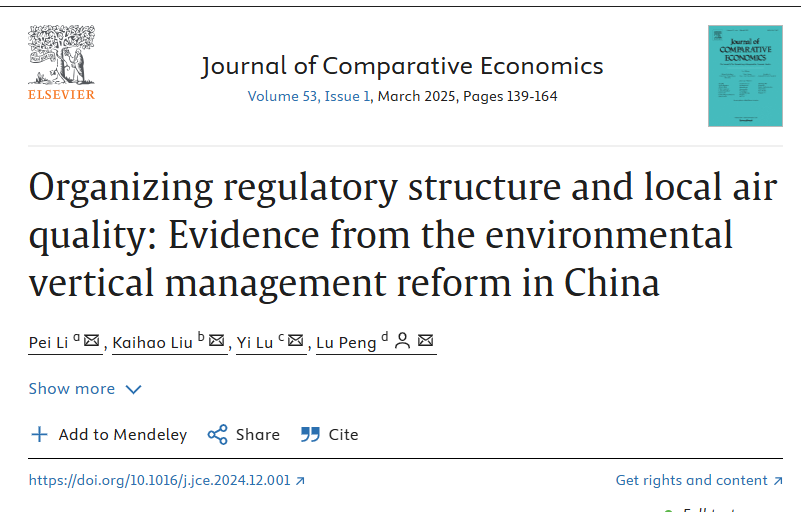 刘铠豪副教授与浙江大学李培研究员、清华大学陆毅教授、对外经贸大学彭鹭助理教授合作的研究论文“Organizing Regulatory Structure and Local Air Quality: Evidence from the Environmental Vertical Management Reform in China”发表于Journal of Comparative Economics。刘铠豪副教授为共同第一作者。本文研究了中国环保垂直管理这一新的改革制度,通过分析改革的分阶段实施情况,研究发现空气质量指数显著下降了25.1%。这一改善主要归因于地方对一线环境监管机构的影响削弱、地方与其上级监管人员效力一致以及地方政府在更加公正的监管环境中对环境保护付出更多的努力。本研究强调了将管理权分配给不同行政级别的有效性,有助于重新塑造地方环保监管人员的激励机制,提高执行效率并促进政策目标的实现。