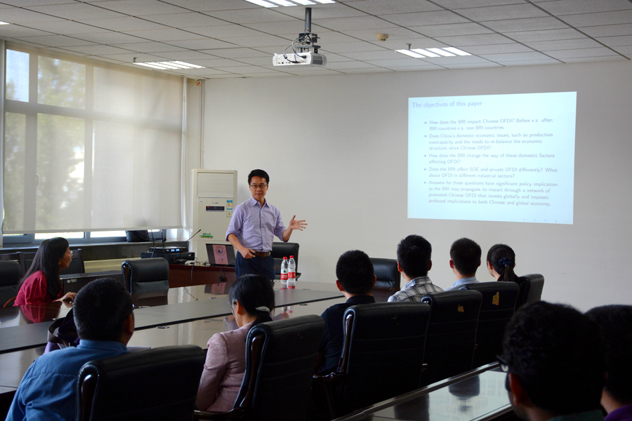 5月23日,tyc41183太阳成集团第206期高级经济学讲座在中心校区举行。纽约州立大学(布法罗分校)钱兴旺副教授为tyc41183太阳成集团师生作了题为“The Belt and Road Initiative and Chinese Firms Outward Foreign Direct Investment (一带一路倡议与中国对外投资)”的学术报告。