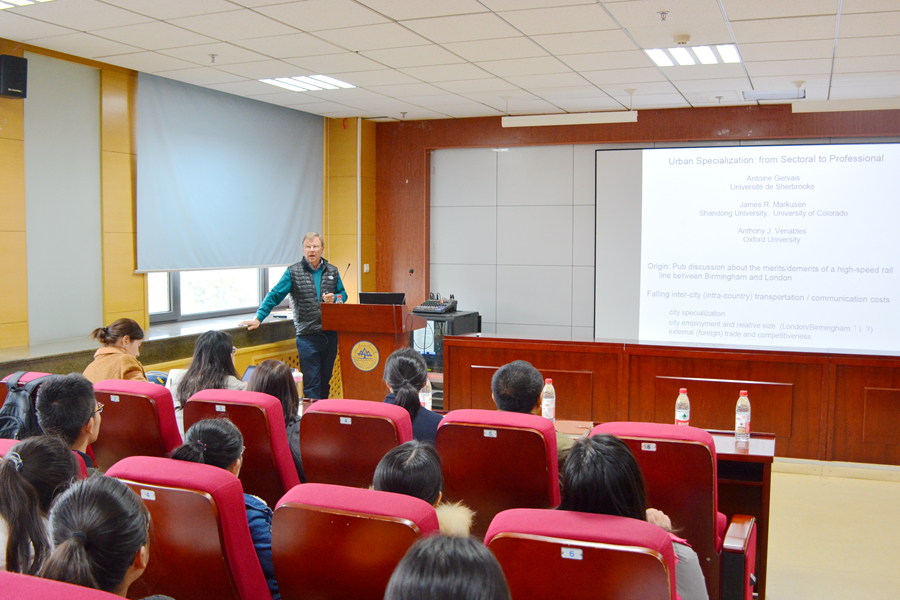11月7日下午,tyc41183太阳成集团第228期高级经济学讲座在中心校区举行。美国科罗拉多大学波尔得分校经济学教授 James R. Markusen为tyc41183太阳成集团师生带来了题为“Urban Specialization: from Sectoral to Professional”的学术报告。