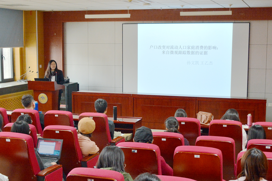 首先,报告指出,在户口改革的大背景下, 流动人口获得户口越来越容易,但是农民工通过户口转变成为城市居民后,其家庭消费率的变化是未知的,户口改革是否一定会如同预期一般释放流动人口的消费潜力以及户口获得对于消费行为的影响在短期和长期是否一致也是不确定的。因此,研究流动人口户口改变对消费行为影响对于评估户口改革的经济效应具有重要的现实意义。报告基于CFPS三期追踪数据,采用倾向得分匹配与双重差分相结合的方法克服遗漏变量和自选择问题,分析了户口改变对流动人口家庭消费行为的影响。报告发现,对于农民工群体,短期中户口改变显著提高了家庭收入和消费,但降低了家庭消费率。长期中,户口改变相比于反事实状态对消费率提高有所帮助,社会保障变动也对此结果有解释力。对于城市流动人口,无论长期还是短期,获得本地户口不显著改变家庭消费行为。报告为理解户口对消费影响提供了新证据,并且有更直接的政策含义,即户口开放可以更多关注农民工群体,对户口开放经济效应也应有长远眼光。报告结束后,王乙杰博士与现场师生进行了互动,并针对相关问题作了解答。