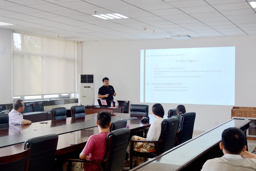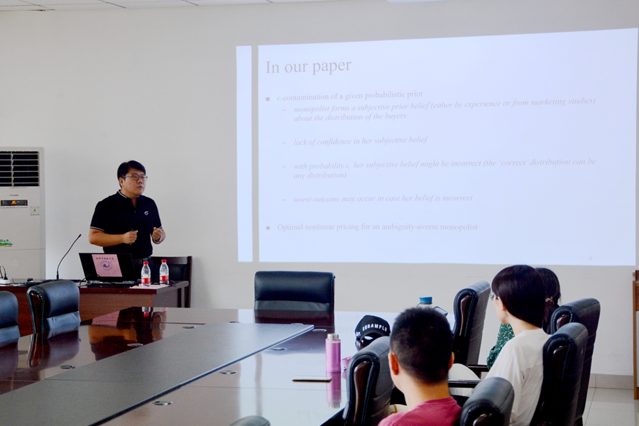 6月25日上午,tyc41183太阳成集团第259期高级经济学讲座在中心校区举行。澳门大学经济学博士王冲为学院师生带来了题为“Optimal nonlinear pricing by a monopolist with information ambiguity”(具有信息模糊性的垄断者的最优非线性定价)的学术报告。