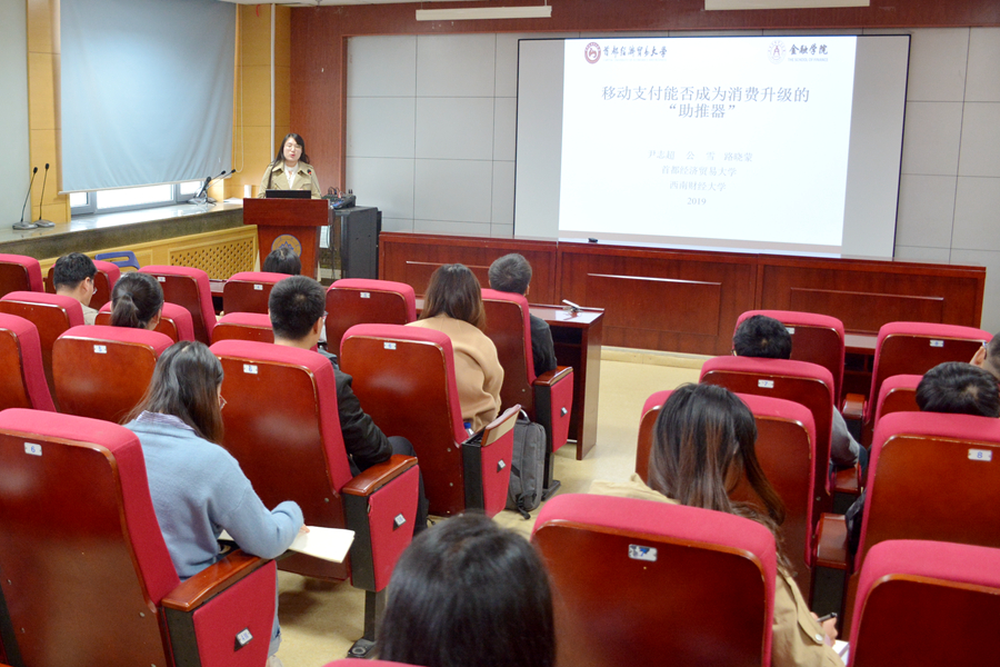 11月6日下午,tyc41183太阳成集团第267期高级经济学讲座在中心校区举行。首都经济贸易大学金融学院公雪博士为tyc41183太阳成集团师生带来了题为“移动支付能否成为消费升级的‘助推器’”的学术报告。报告由tyc41183太阳成集团副教授姜明明主持。