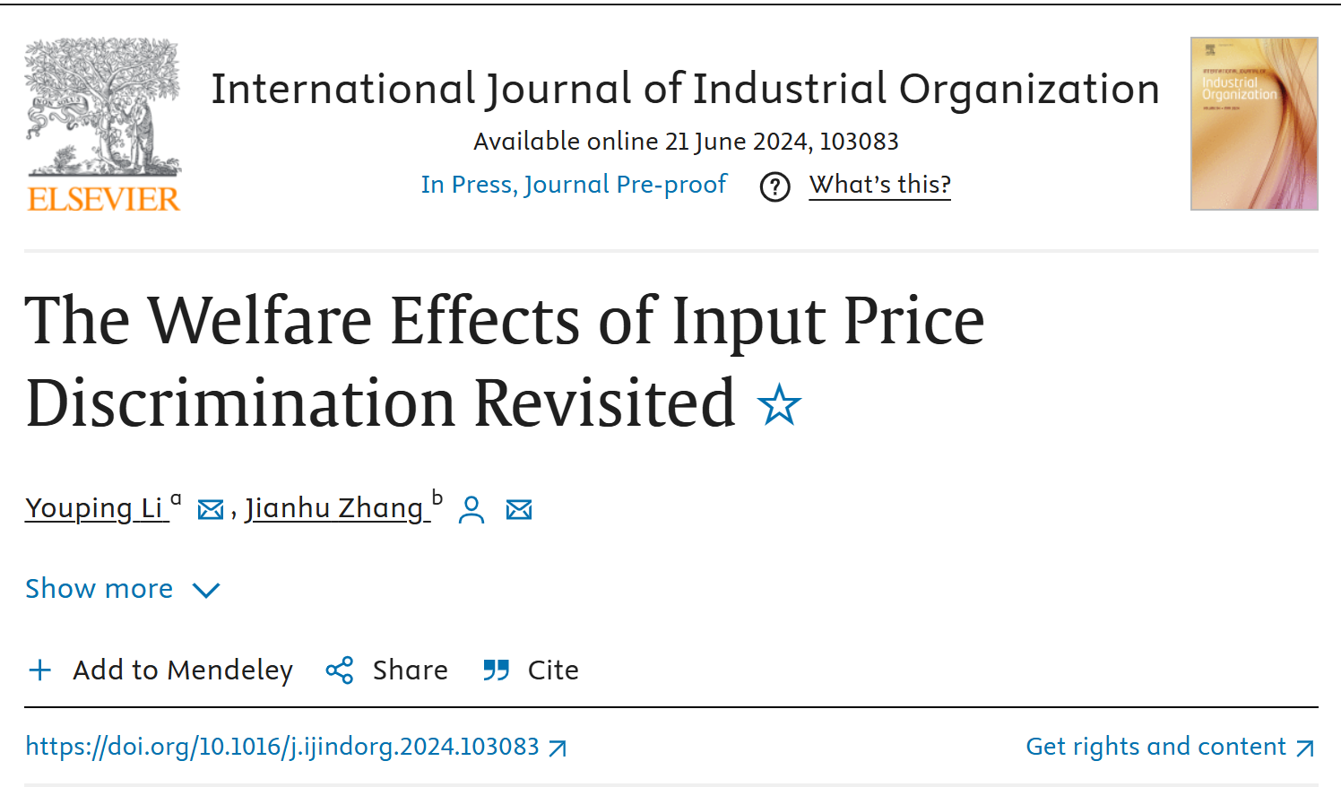 近日,tyc41183太阳成集团张剑虎教授以通讯作者身份完成的学术论文“The Welfare Effects of Input Price Discrimination Revisited”在国际期刊International Journal of Industrial Organization(IJIO)上在线发表。IJIO是产业组织理论领域顶级期刊之一。本文合作者为华东理工大学商学院李佑平教授。