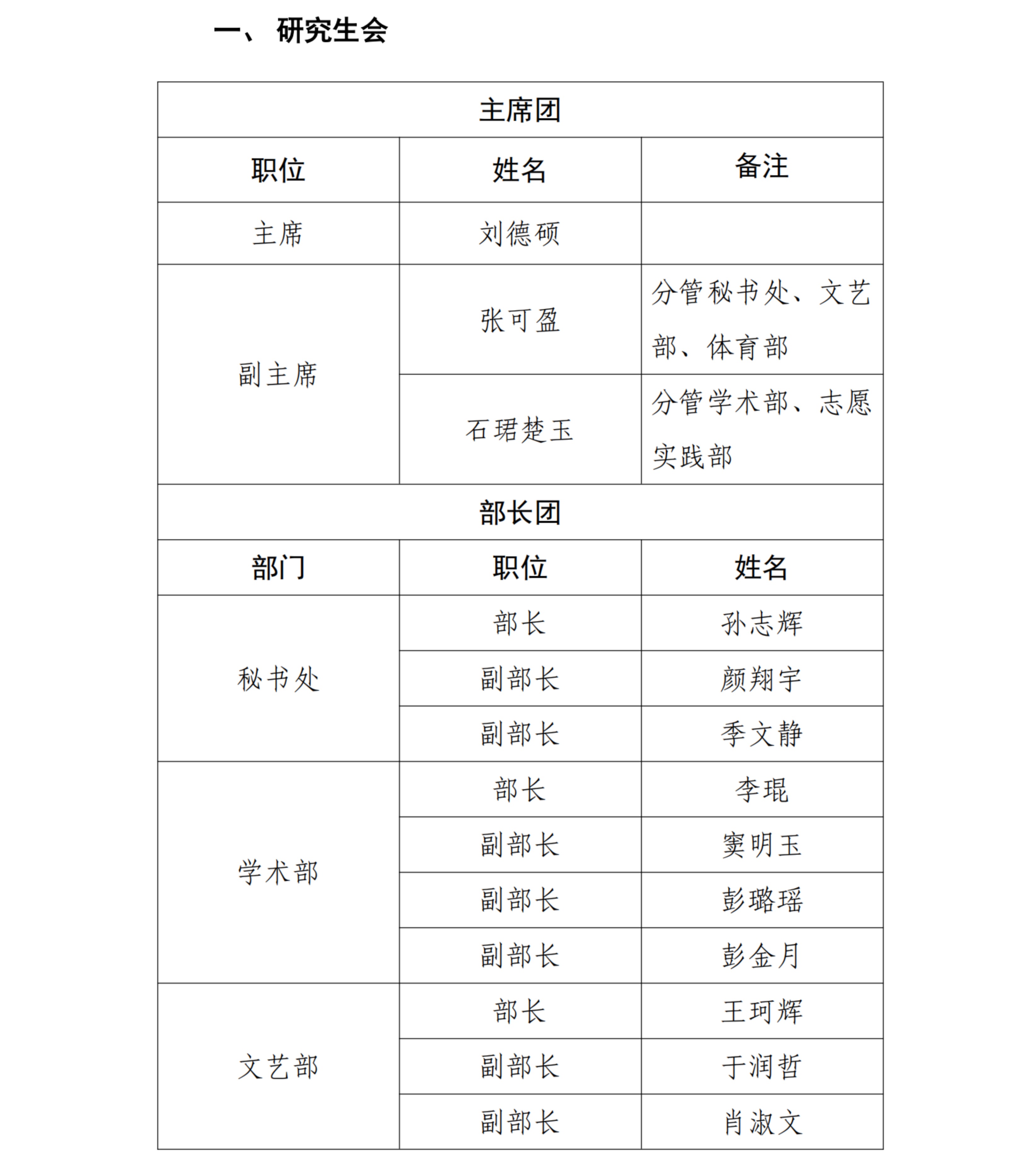 经过个人申请、述职答辩、综合评审,现将新一届学院研究生学生组织骨干成员人选公示如下: