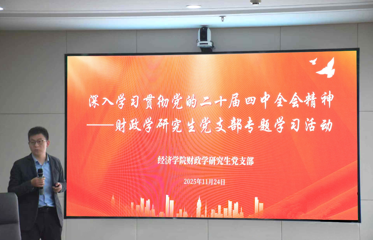 财政系教师党支部书记黄继雷在总结发言中高度评价了活动中同学们的扎实的专业基础和深厚的家国情怀。他指出,此次活动是学习贯彻党的二十届四中全会精神、推动党建与科研深度融合的生动实践。他强调要深刻把握财政在国家治理中的基础性和支柱性作用,始终将服务国家战略作为财政学研究的根本遵循,并勉励全体研究生党员薪火相传、继往开来,在学术研究中深耕不辍,在社会实践中守正创新,为强国建设、民族复兴伟业贡献财政智慧和山大力量。