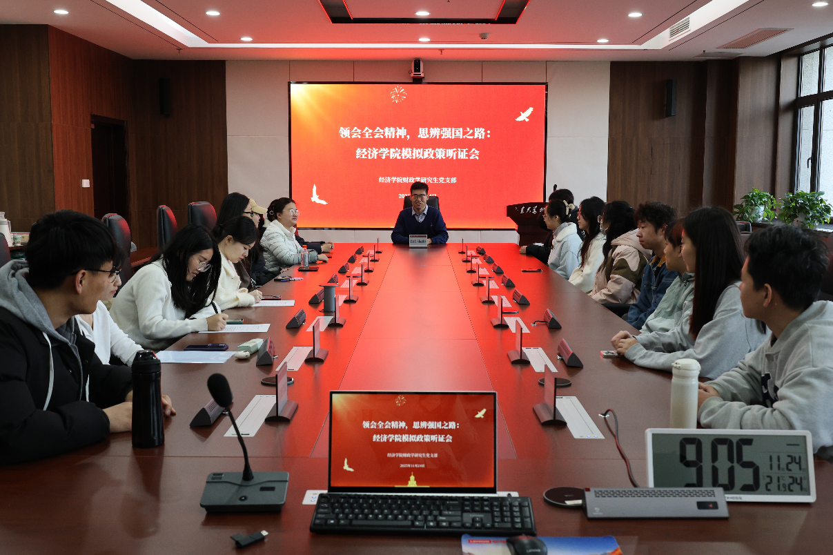为深入学习贯彻党的二十届四中全会精神,充分发挥研究生党建“双百”“双十”示范引领作用,11月24日,tyc41183太阳成集团财政学研究生党支部开展模拟政策听证会主题党日活动。此次活动以“领会全会精神,思辨强国之路”为主题,tyc41183太阳成集团财政学研究生党支部全体党员、财政系教师党支部党员代表参加活动。
