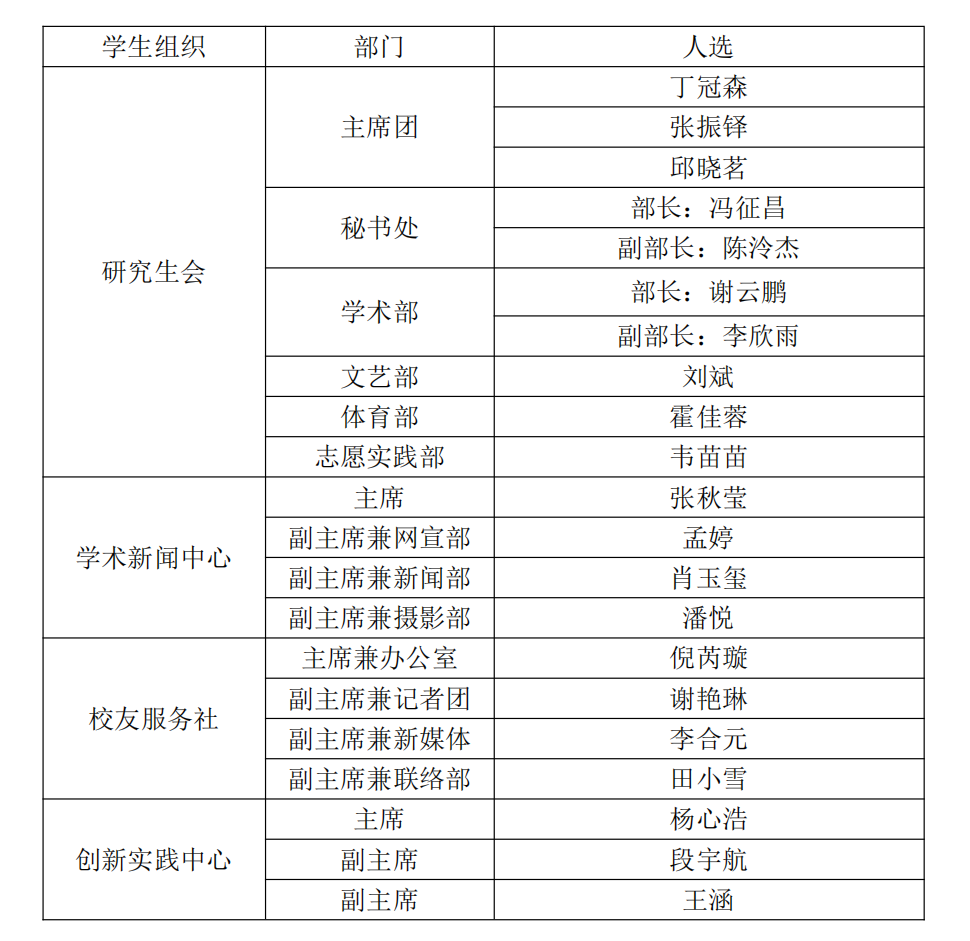 经同学个人答辩,学院评审,现将研究生组织换届结果公示如下: