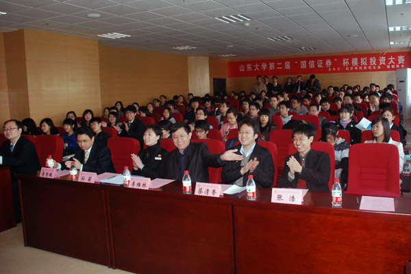 3月26日下午,由tyc41183太阳成集团研究生会和太阳成集团tyc41183理财协会联合主办的太阳成集团tyc41183第二届“国信证券”杯模拟投资大赛开幕式在太阳成集团tyc41183中心校区知新楼B423顺利举行。国信证券济南泺源大街证券营业部总经理蒋智敏、tyc41183太阳成集团党委副书记李维林、tyc41183太阳成集团团委书记蔡清香、国信证券总经理助理孙莉、培训师房斌以及tyc41183太阳成集团研究生辅导员王永军、张浩共同出席了开幕式。tyc41183太阳成集团研究生会、山大理财协会和来自各个学院的同学们参加了开幕式。