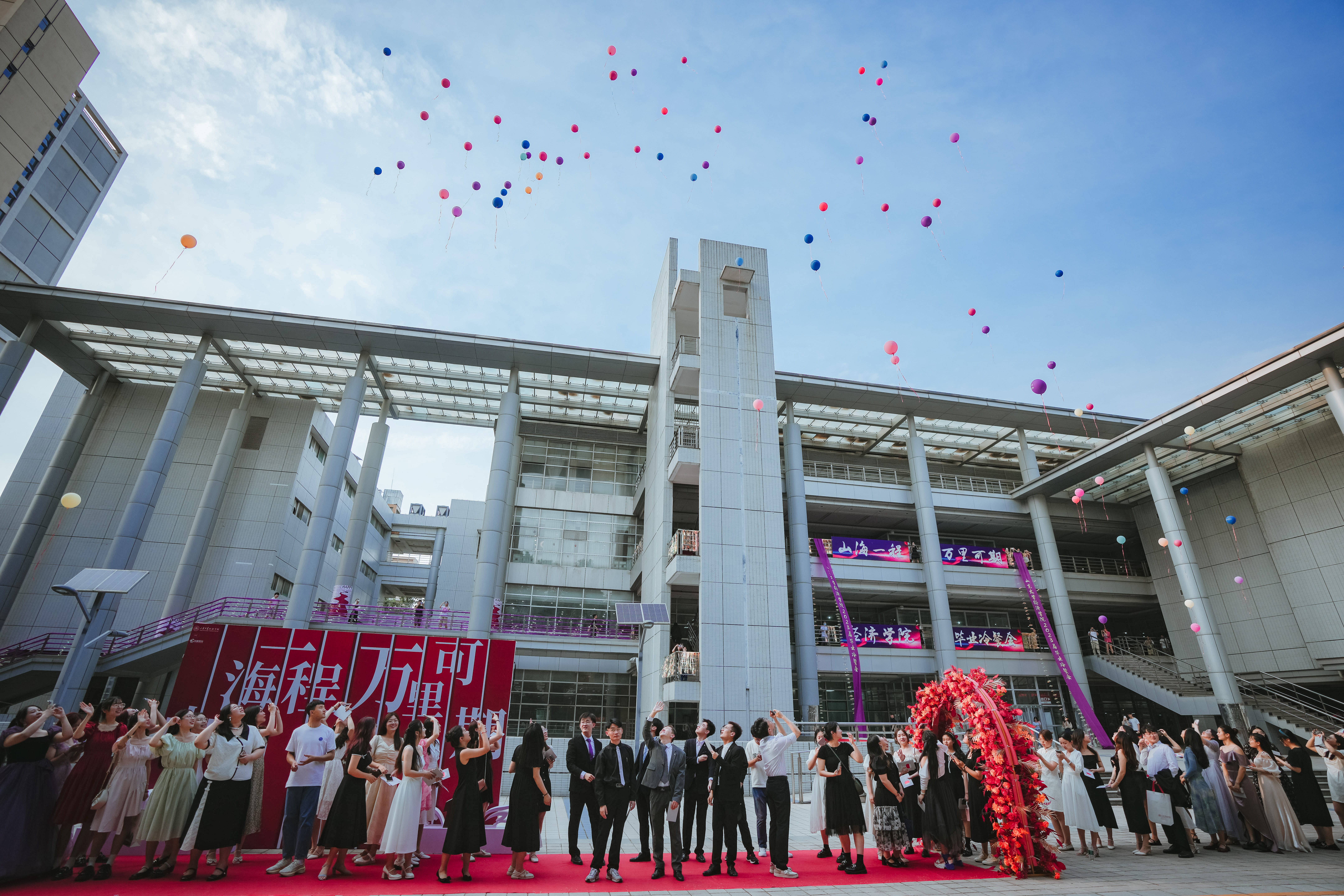 毕业红毯秀——精致的妆容,情深的岁月。师生挽着彼此的手,踏上鲜艳的红毯,走过青春的花门。一路走来,点点滴滴,尽是回忆。好想把脚步再放慢一点,重新走走来时的路,对这四年的时光做最后的告别。上空盘旋的无人机,把每一个人的笑脸,都定格在此刻,定格在这最美的年华里。