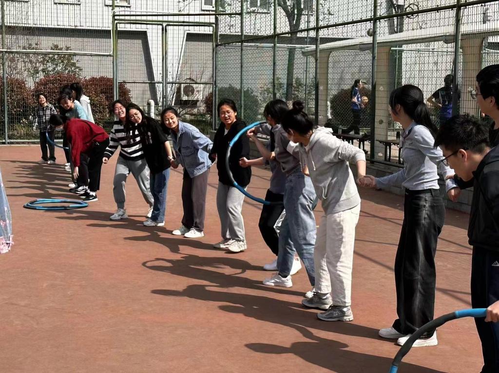 本次趣味心理挑战赛由共享位置捉迷藏、袋鼠跳、呼啦圈传递和生命履带四个项目组成。共享位置捉迷藏游戏在传统捉迷藏游戏的基础上增加了定位和分享位置的规则,旨在提高更多人的参与感,增强玩家之间的社交体验,从而建立更多的社交联系。同学们在参与过程中,一边欣赏着春意盎然的校园美景,一边在与其他同学互动的过程中获得信赖感、成就感;袋鼠跳项目采用接力赛的方式,选手们双腿并拢站在麻袋里,全力向前跳并尽力保持平衡,既增加了活动的趣味性,又使活动充满挑战性;呼啦圈传递和生命履带项目则更加考验选手们的协调性和合作能力,每个人都是团队的关键一环,是团队中不可或缺的组成部分,只有每个人都保持同样的步调和节奏,才能够顺利快速完成游戏。比赛过程精彩纷呈,场上加油声、欢呼声此起彼伏,趣味心理挑战赛在欢快热闹的气氛中落下帷幕。