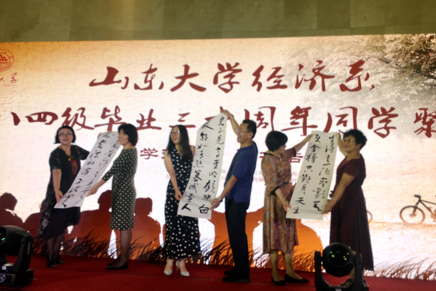 座谈会场面温馨感人,文艺节目点缀其中。师生走秀展现了校友们年轻的心态,诗朗诵《同学地图》倾诉了毕业30年聚首山大校园的激动心情,书法作品《将进酒·君不见》表达了校友们迈进新时代的豪迈之情,《明天会更好》唱出了对母校、对老师、对同窗的祝福。伴随着聚会视频,大家一起回忆了三十多年前大学生活的点点滴滴,畅谈了伴随着经济社会发展三十年的感悟与收获。回首昨天,是师生情、同窗谊,是感恩、感激;展望明天,虽不再年少,却希望依旧,是憧憬、是祝福;是一份久别重逢的喜悦,是三十年情谊积淀的迸发,是一份值得回味终生记忆。