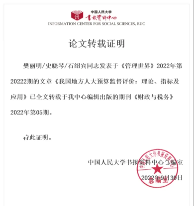 在《财政研究》发表《中国抗击新冠肺炎疫情中对口支援何以发生》;在《财政科学》发表《“省直管县”促进了县域经济增长吗?》;在《公共财政研究》发表《高质量发展指标体系设计与省际评估》;在《管理世界》发表《我国地方人大预算监督评价:理论、指标及应用》,并被人大《财政与税务》全文转载;在《山东人大工作》发表《人大预算监督视域下的全过程人民民主》。