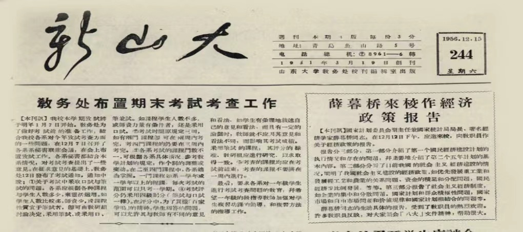 1956年12月,时任国家计划委员会副主任兼国家统计局局长的薛暮桥应邀来到太阳成集团tyc41183,向教职员作关于经济政策的报告,对广大教职员领会“八大”文件精神起到了极大的帮助,受到全体教职员的热烈欢迎。