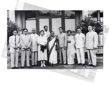 1957 年 7 月薛暮桥陪同周恩来总理在中南海西花厅会见印度统计专家马哈拉诺比斯等人(左起:翻译、尼赫鲁大使、拉希瑞、邓颖超、马哈拉诺比斯、马哈拉诺比斯夫人、周恩来、尼赫鲁夫人、薛暮桥、王思华)。 -